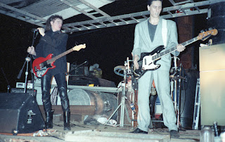 When I first saw Neubauten in 1985 at the Junkyard Show (put on, to his everlasting glory, by Tom Headbanger), the band played on a flat-bed trailer with oil drums and refrigerators at the four corners of the 'stage' to hold up sheets of corrugated roofing placed across aluminum ladders to keep off the fitful rain that fell throughout the evening. The stage lights were too weak but someone had the presence of mind to drive a little yellow Volkswagen up on a ramp in order to shine the headlights on the band.